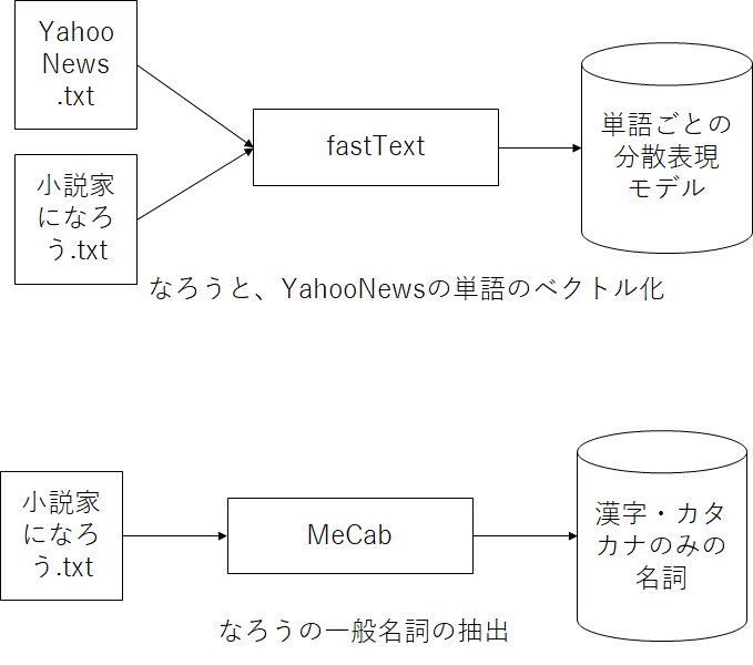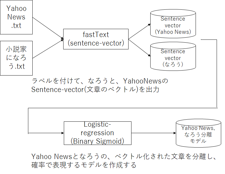 - fastTextのセンテンスベクタライザで、小説家になろうの文章と、Yahoo Newsの文章をベクトル化します。