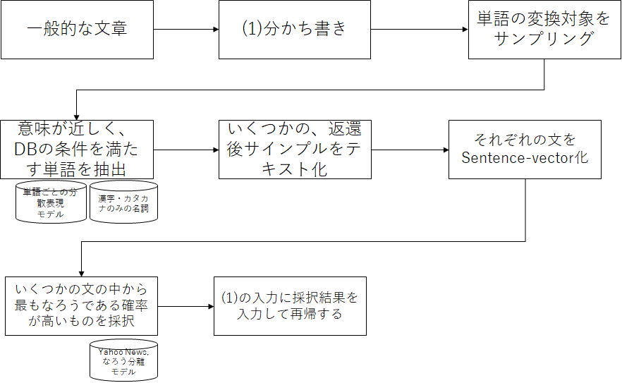 - 任意の文章の単語を(マルコフ)サンプリングで意味が近いという制約を課したまま、小説家になろうの単語に変換*2します