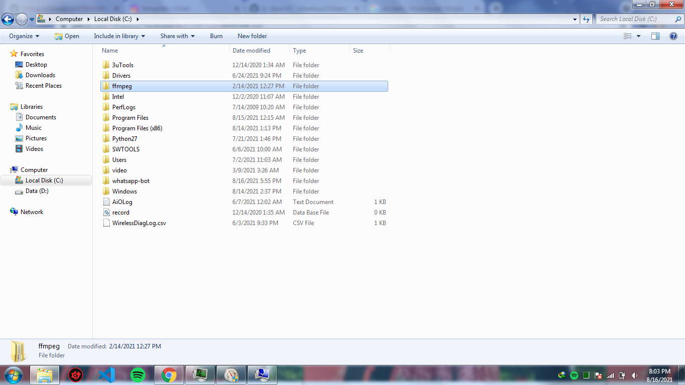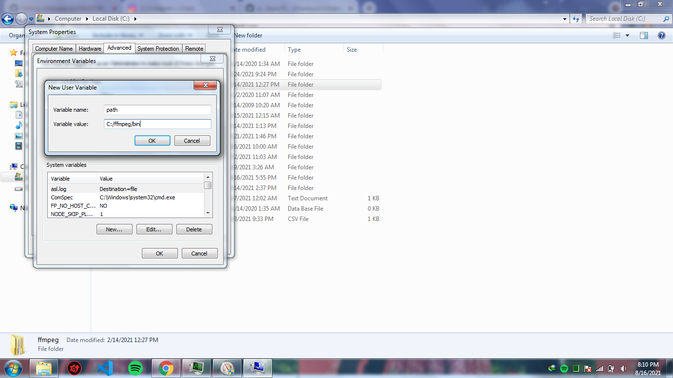 – type variable name into “path” and variable value into “C:/ffmpeg/bin”